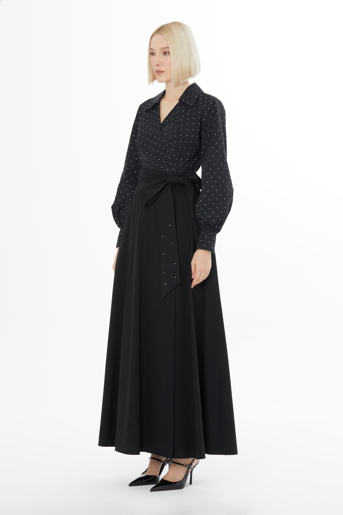 Balon Kollu Bağlamalı Puantiye Siyah Elbise (M5KMZM0291)
