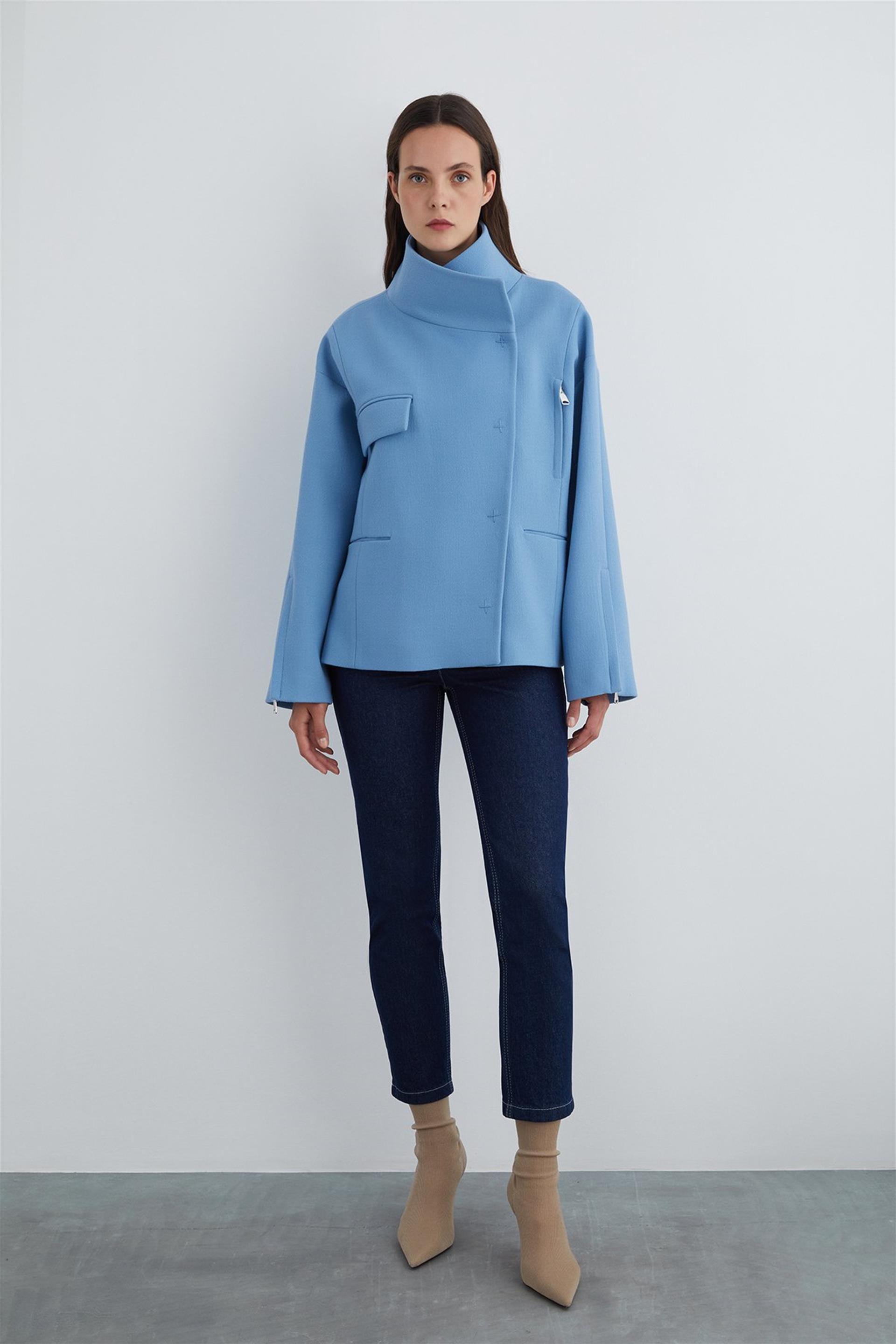 Asymmetric Model Stand-Up Collar Short Black Coat (M3KM4I2151)