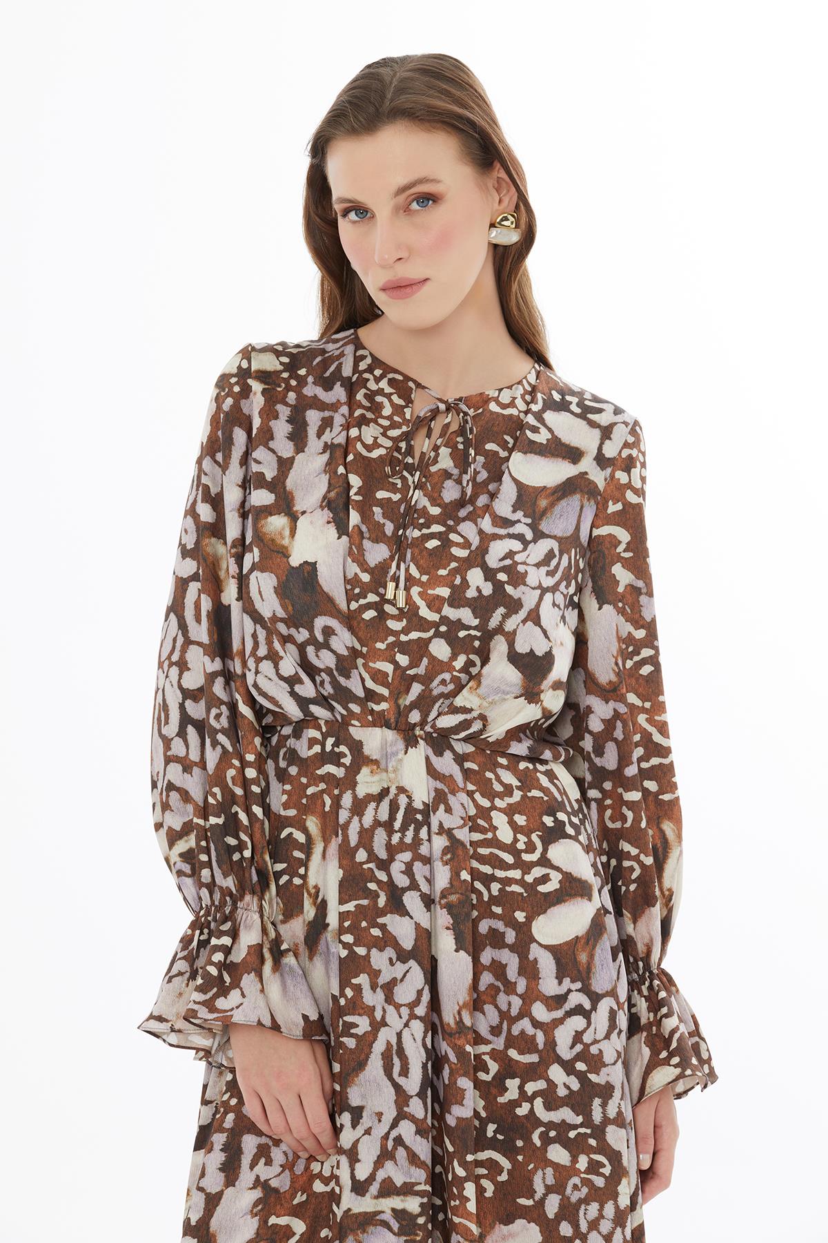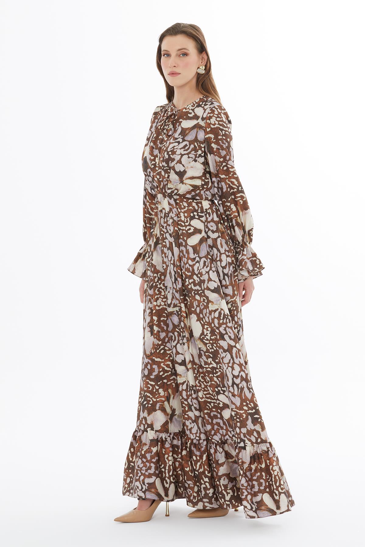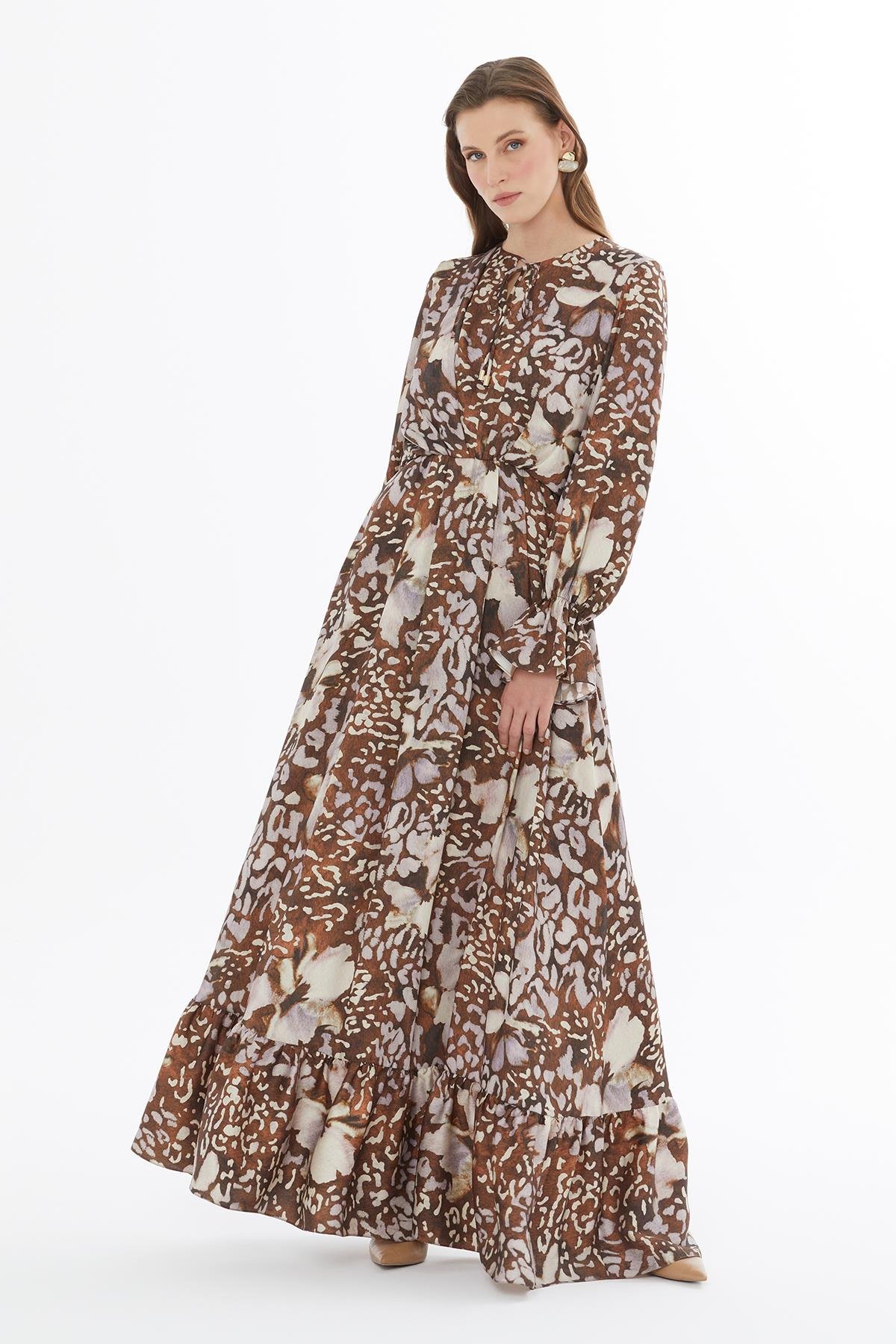 Brown Dress with Round Neck, Front Drawstring and Ruffle Hem (M5KM5M0491)