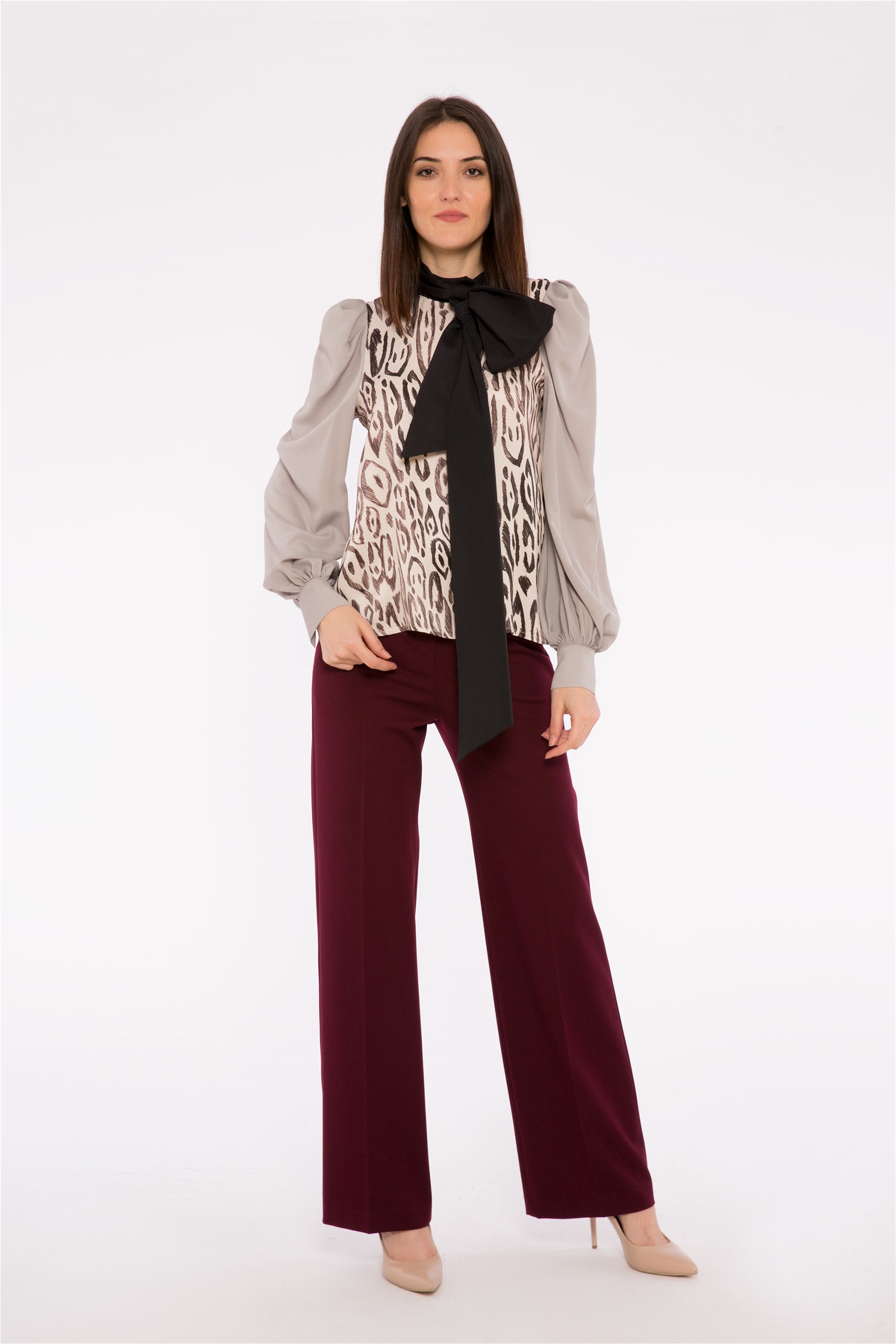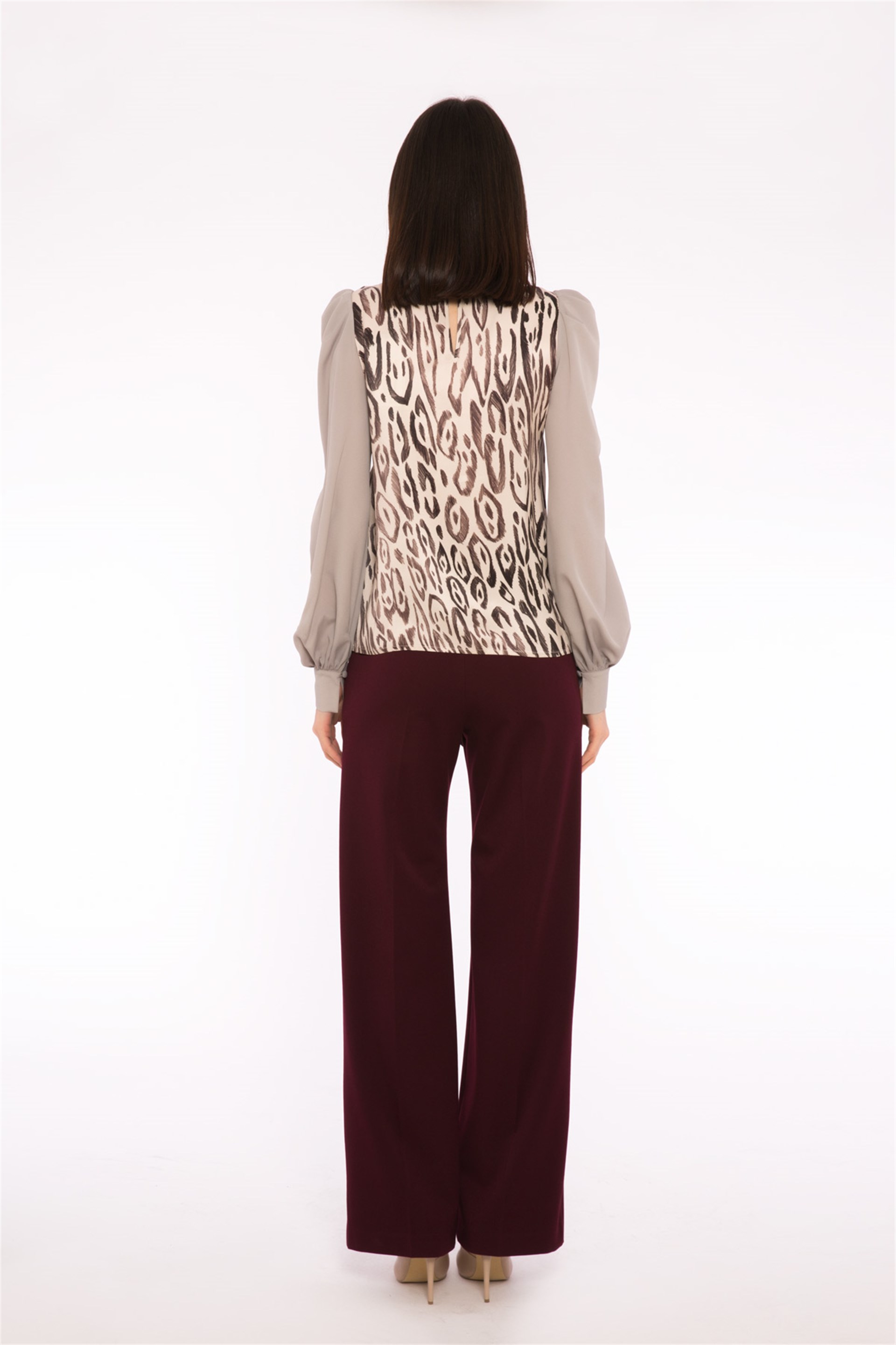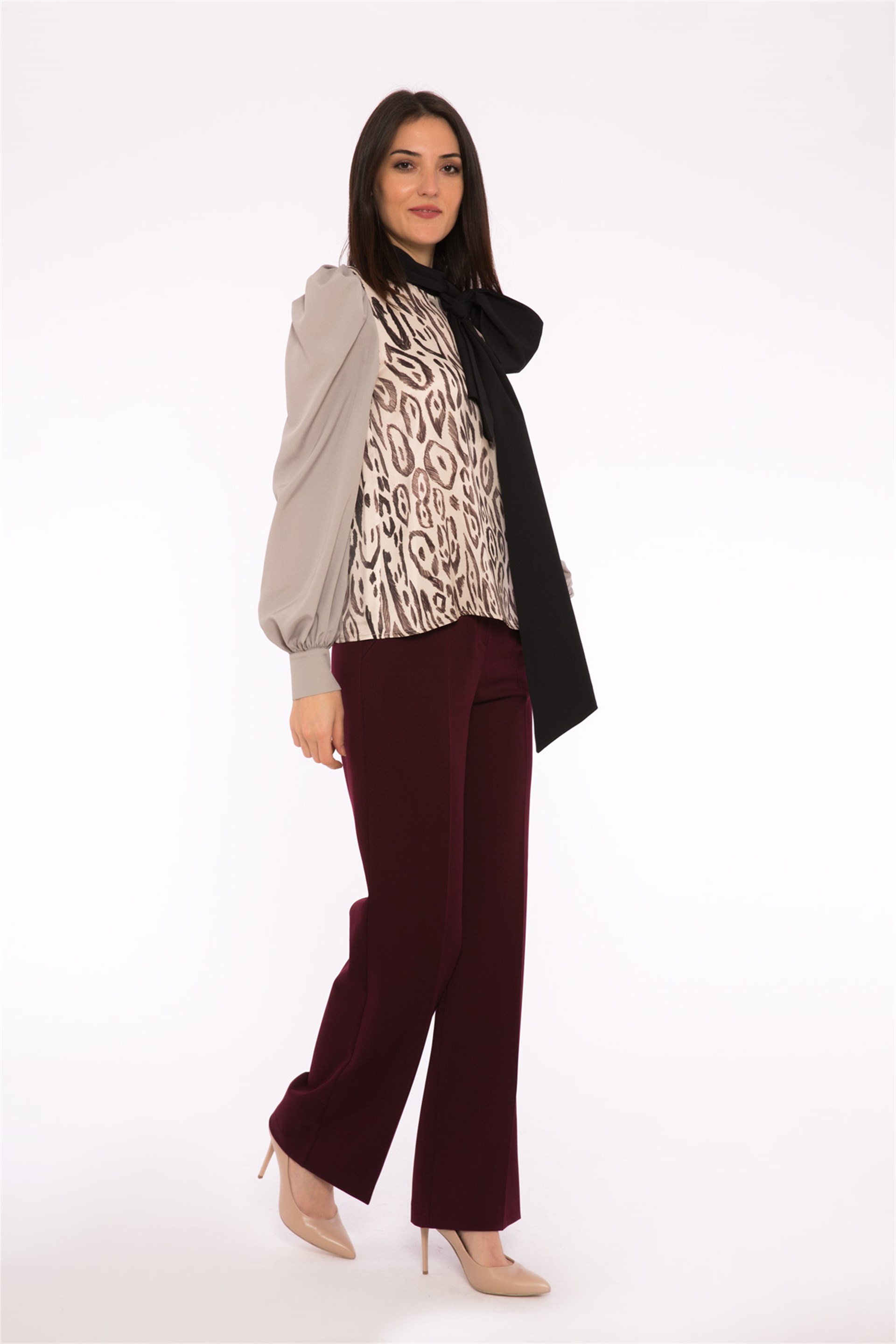 Contrast Detailed Stand Up Collar Floral Pattern Flowy Mink Colored Blouse (M0KMBC0161)