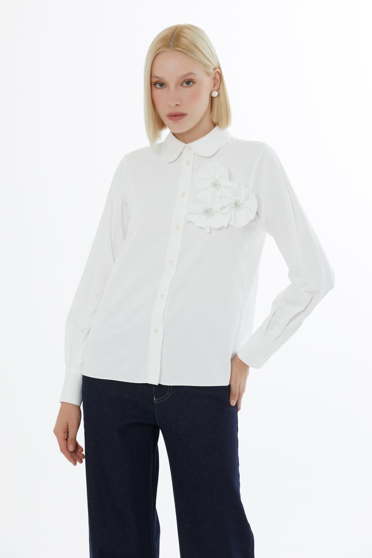 Ecru Blouse with Rose Accessory Detail and Button Closure (M5KMWM0271)