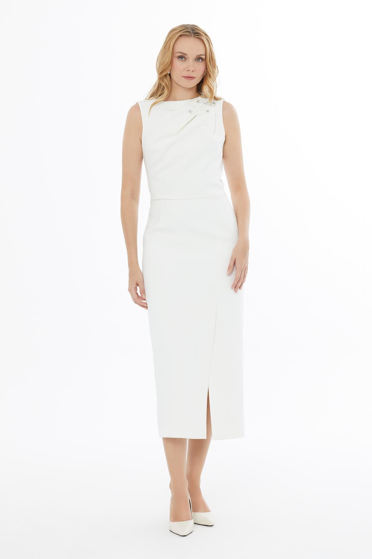 Ecru Dress with Shoulder Drape Detail and Slit (M5KM5M0121)