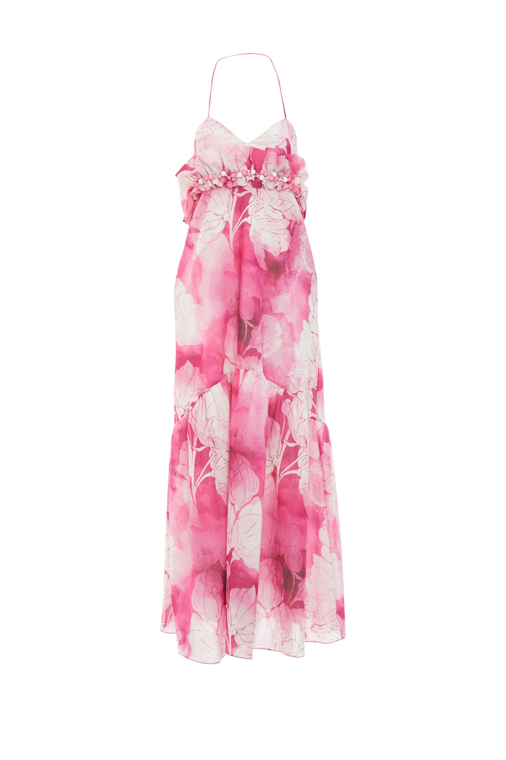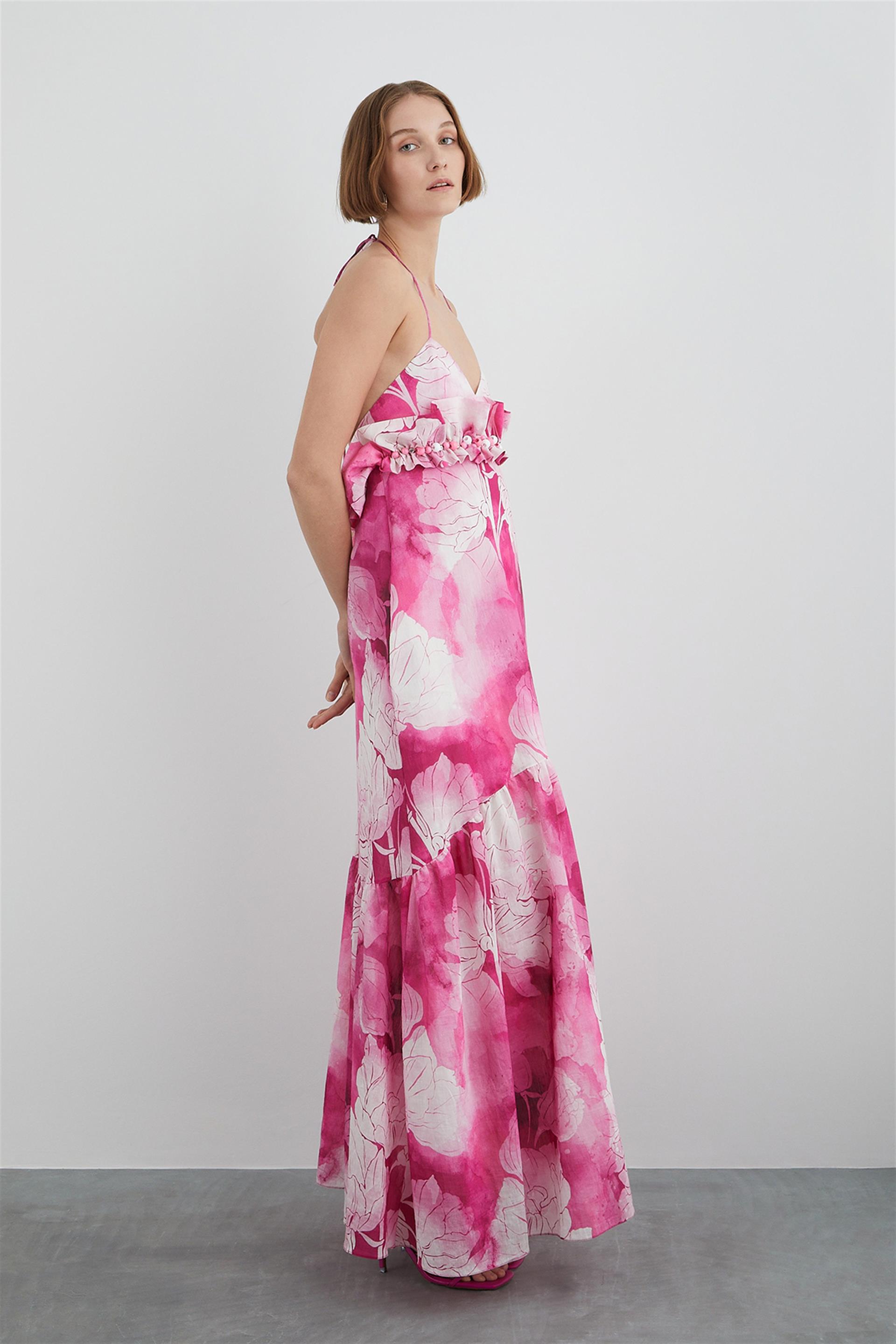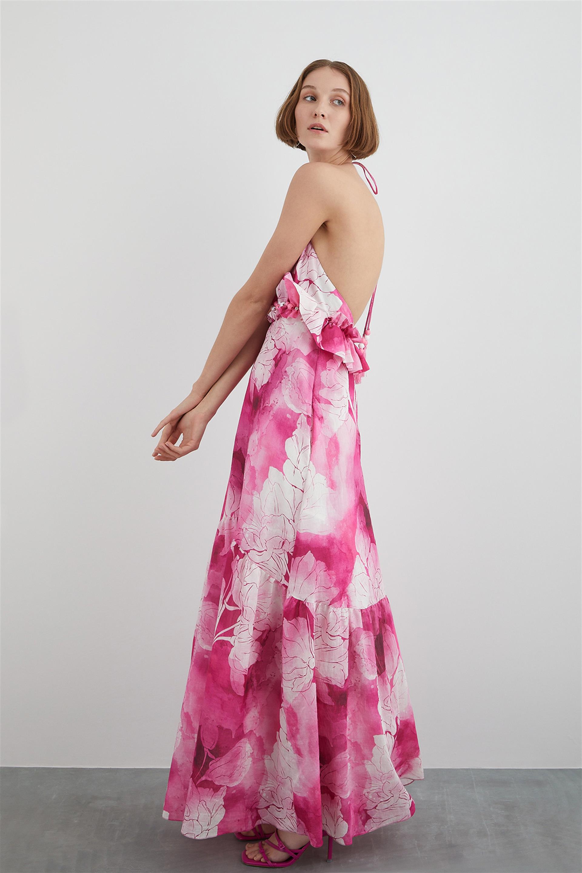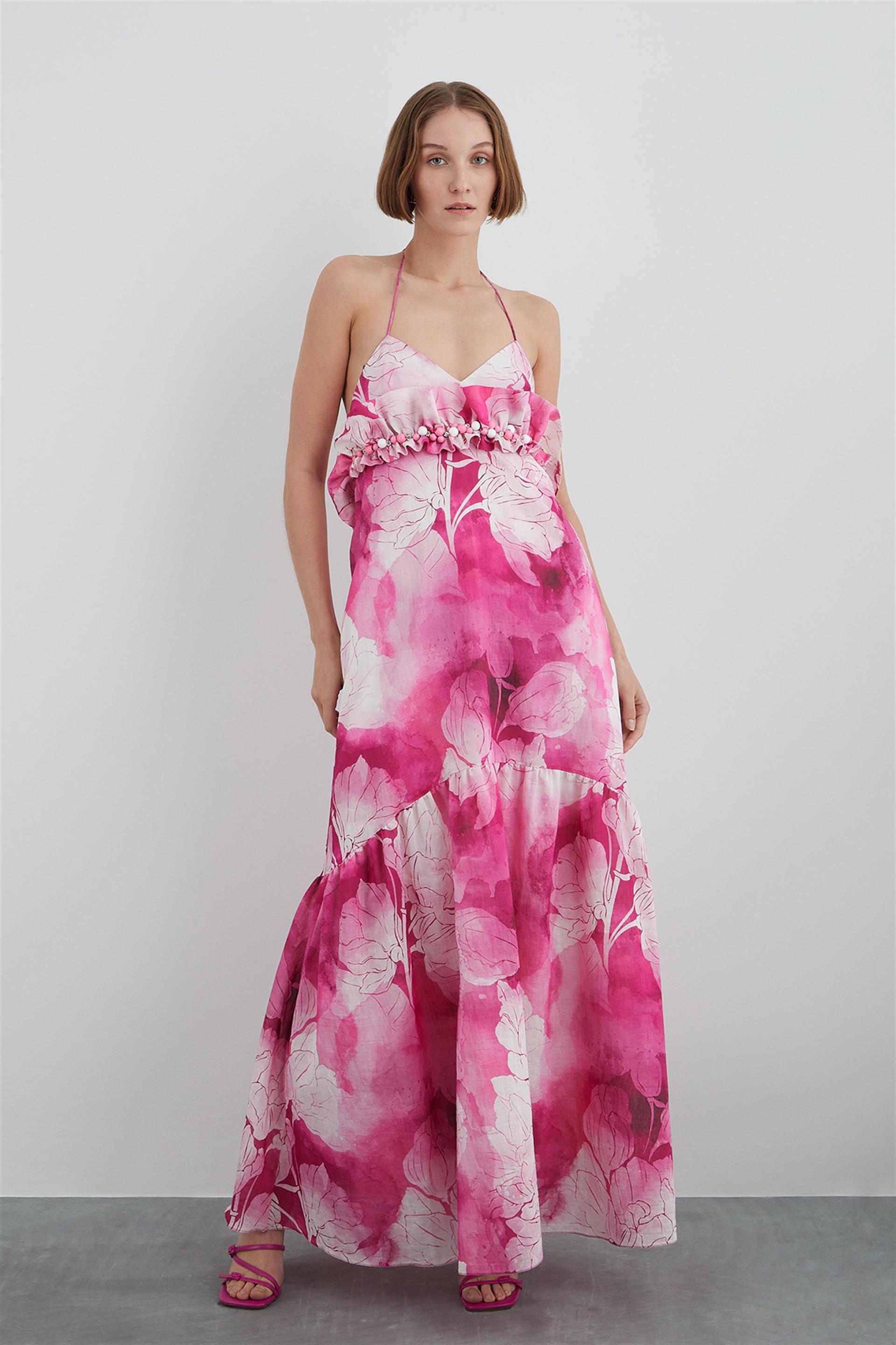 Embroidered Patterned Dress With Flywheel Top With Halterneck Detail (M3YM5H0981)