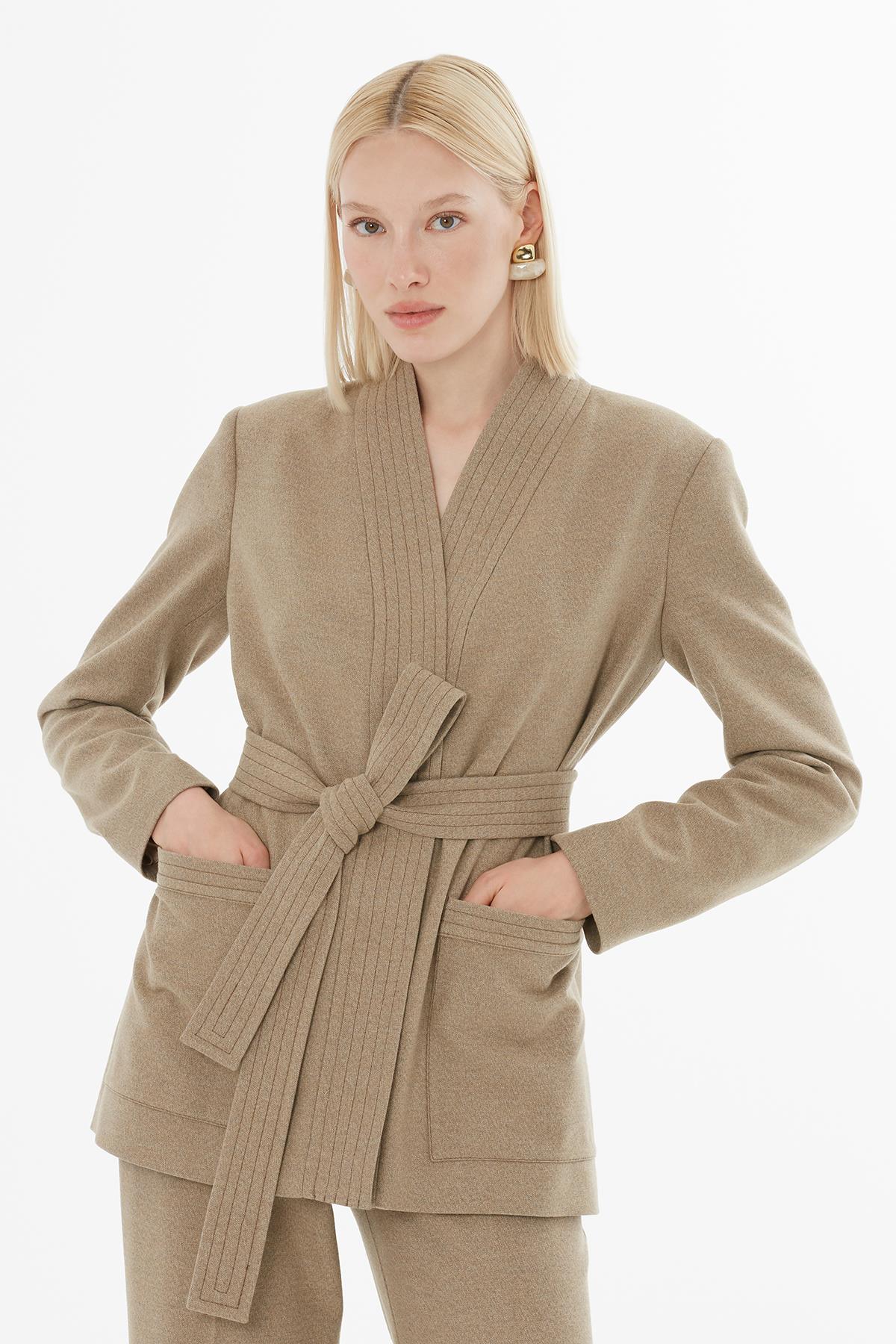 Taupe Set with Belted Jacket and Matching Pants (M5KMTKM318)