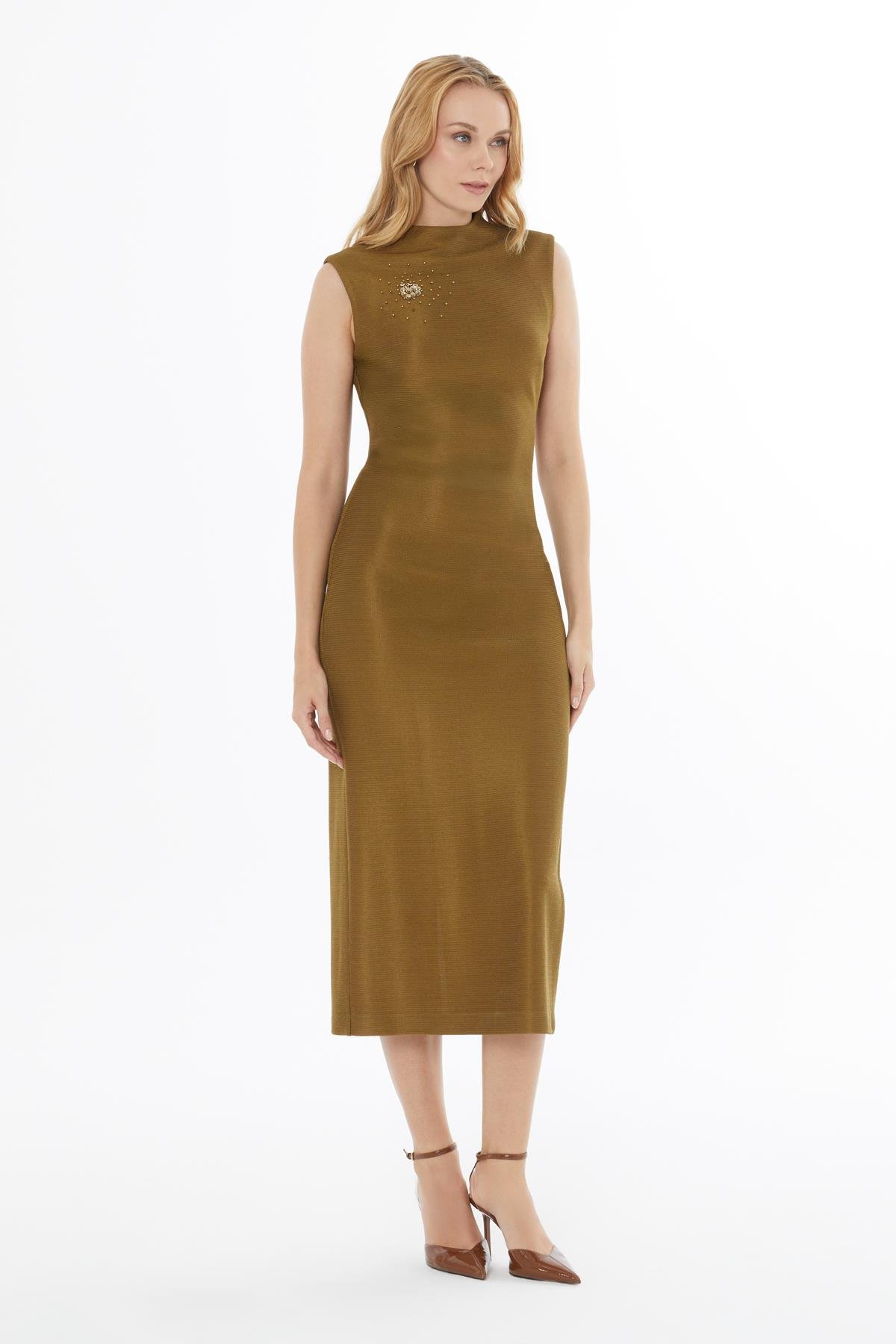 Round Neck Sleeveless Khaki Dress with Zipper Closure and Slit (M5KM5M0411)