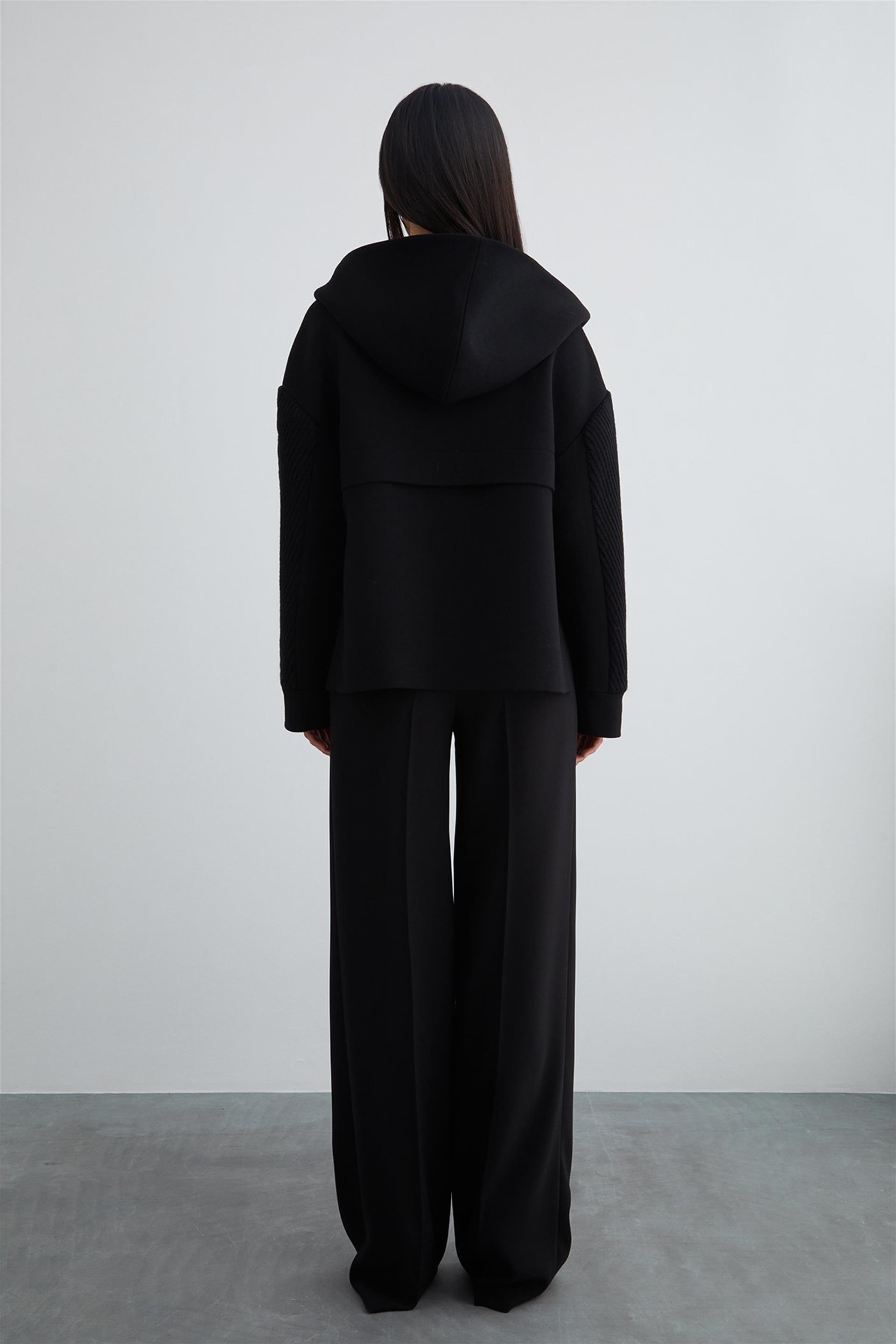 Wide Hooded Sleeve Detail Short Black Coat (M3KM4I2141)