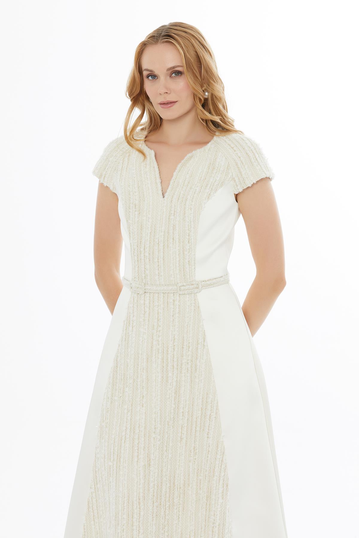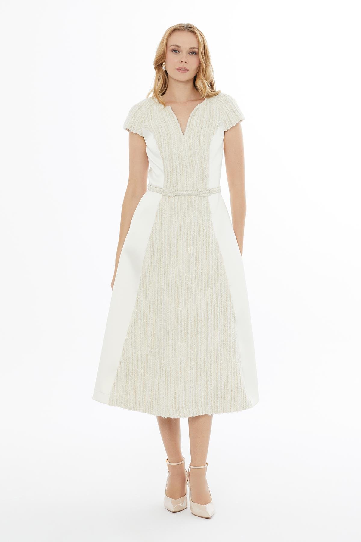 Short Sleeve Cream Dress with V-Neck and Zipper Closure (M5KM5M0521)