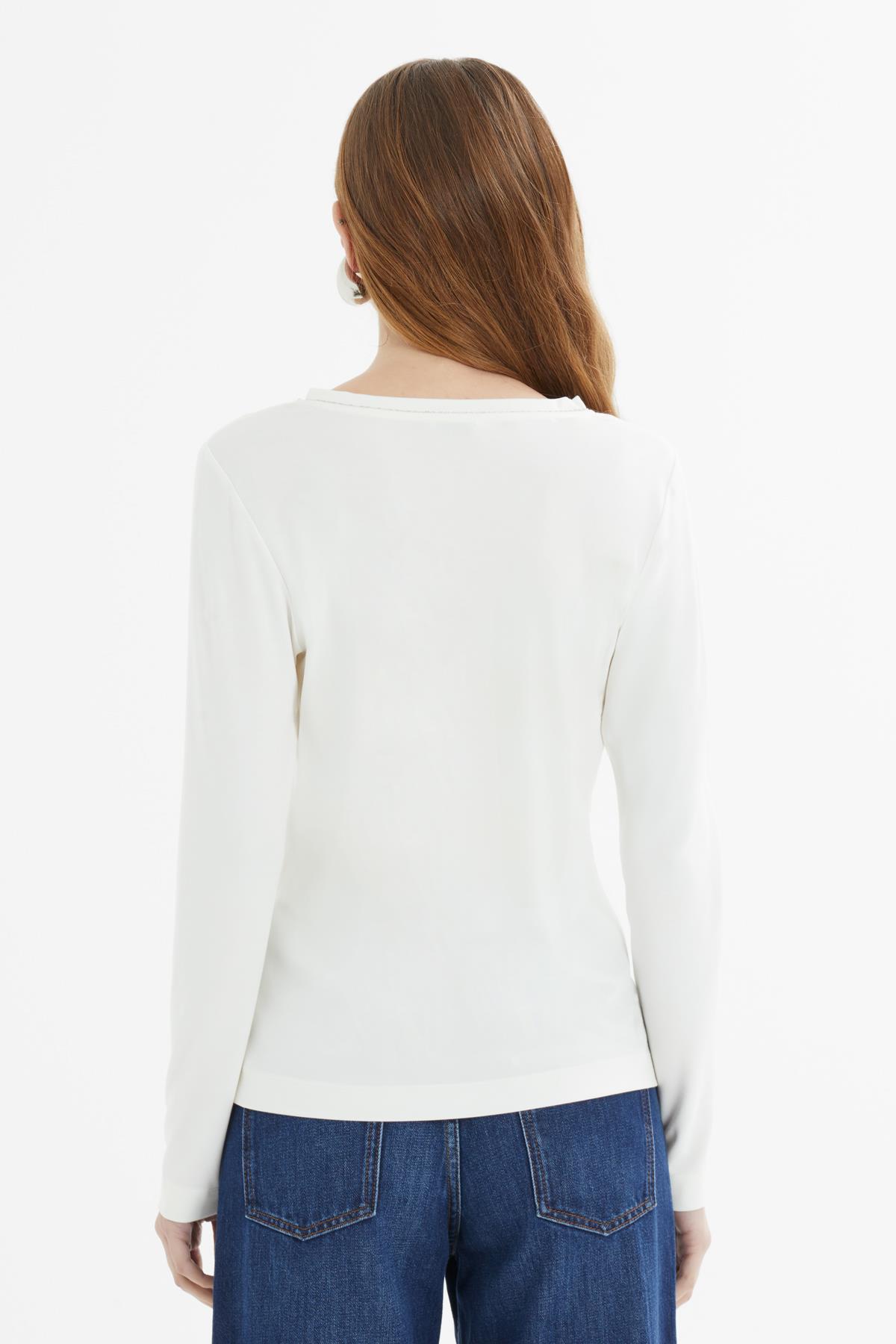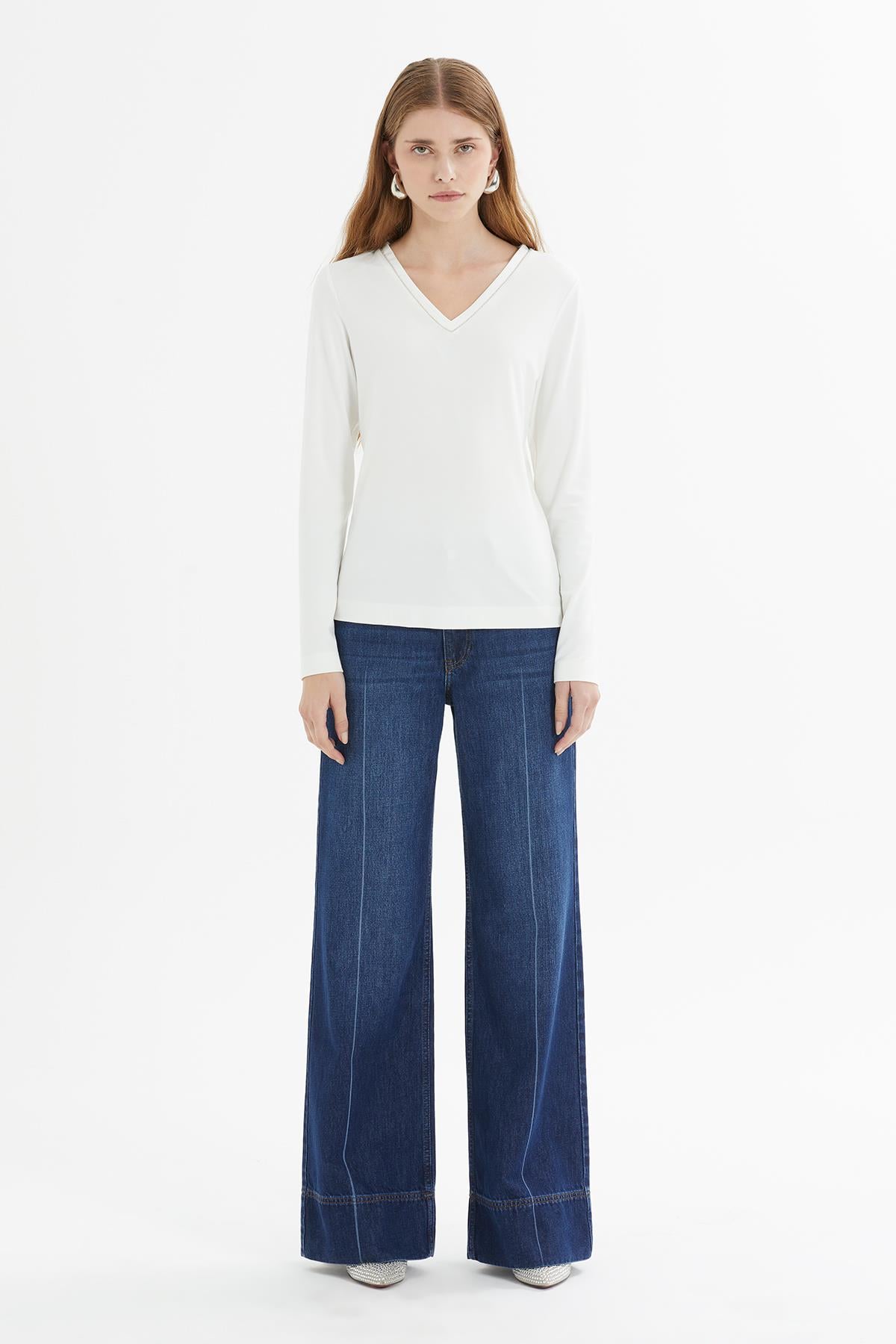 V-Neck Stripe Accessory Detail Off-White Knit Blouse (M4KMWK0241)