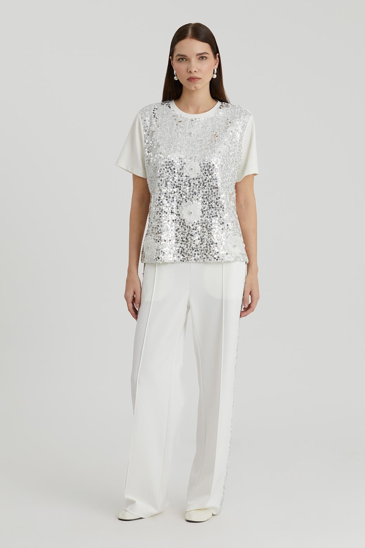 White Floral Embellished Sequin T-Shirt (M6YM2N1661)