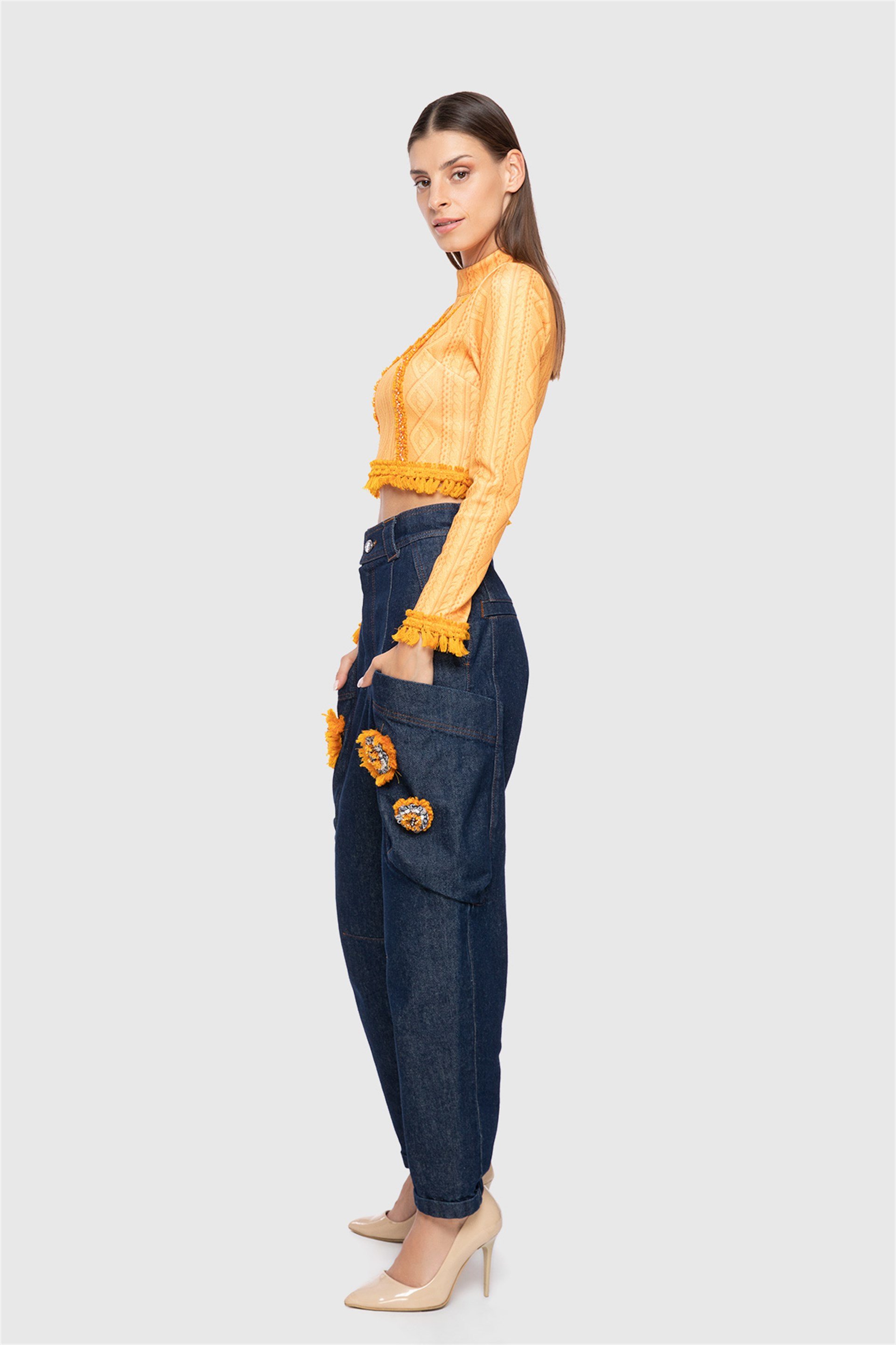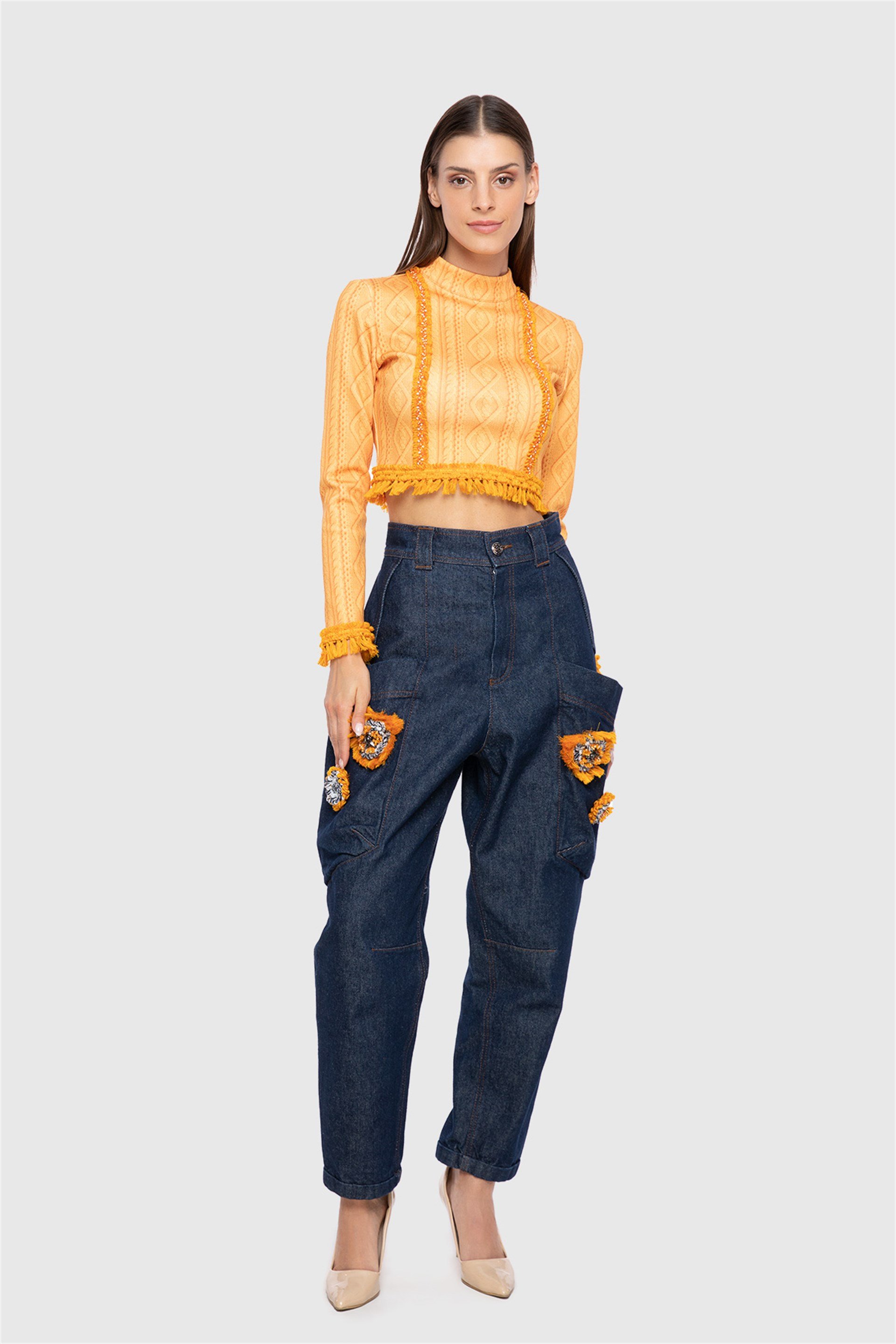 With Embroidered Stripe Detail Pattern Orange Scuba Crop (M2KM2G0071)