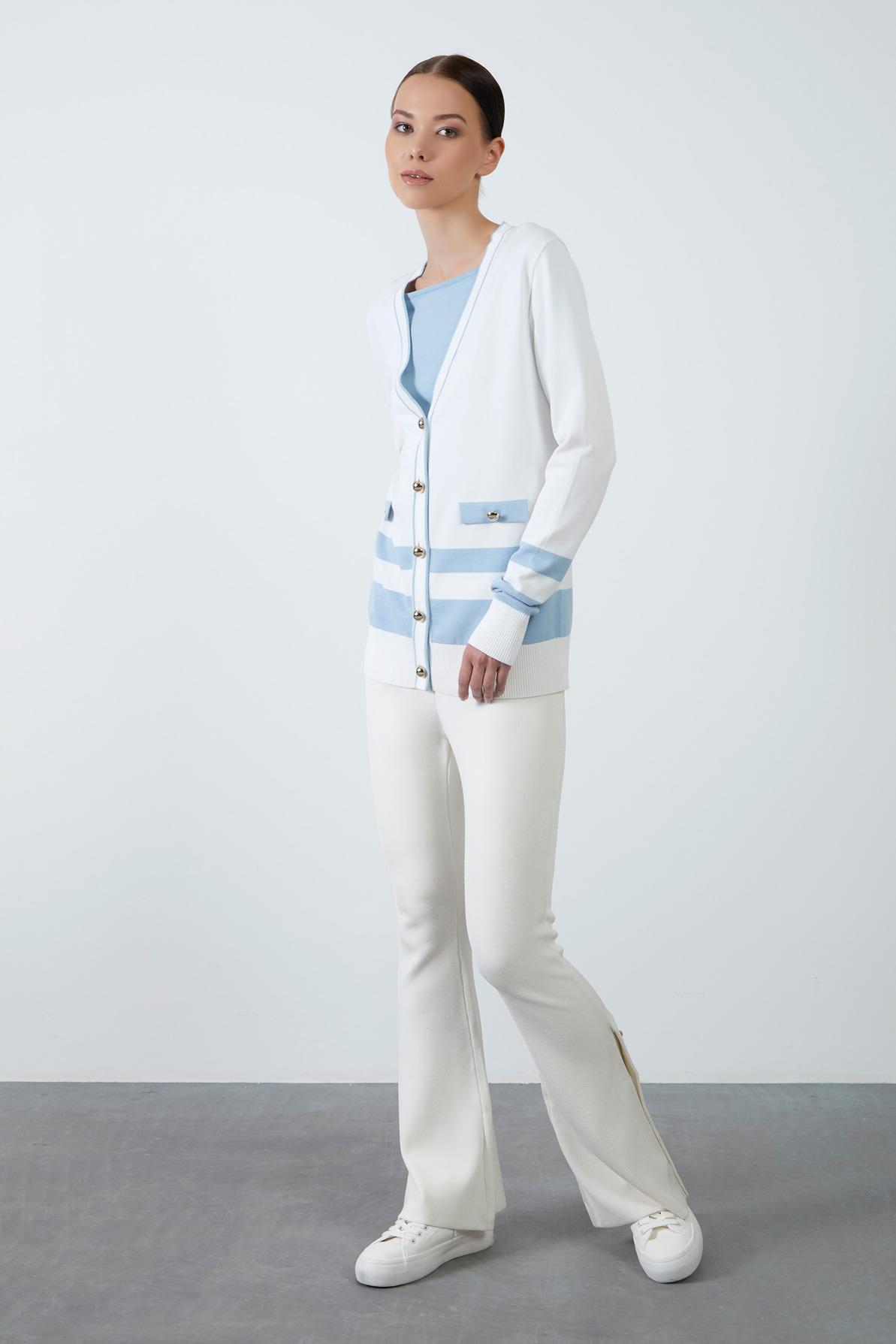 Gold Düğme Detaylı Mavi Çizgili Triko Ekru Hırka (M4YM4J3011)