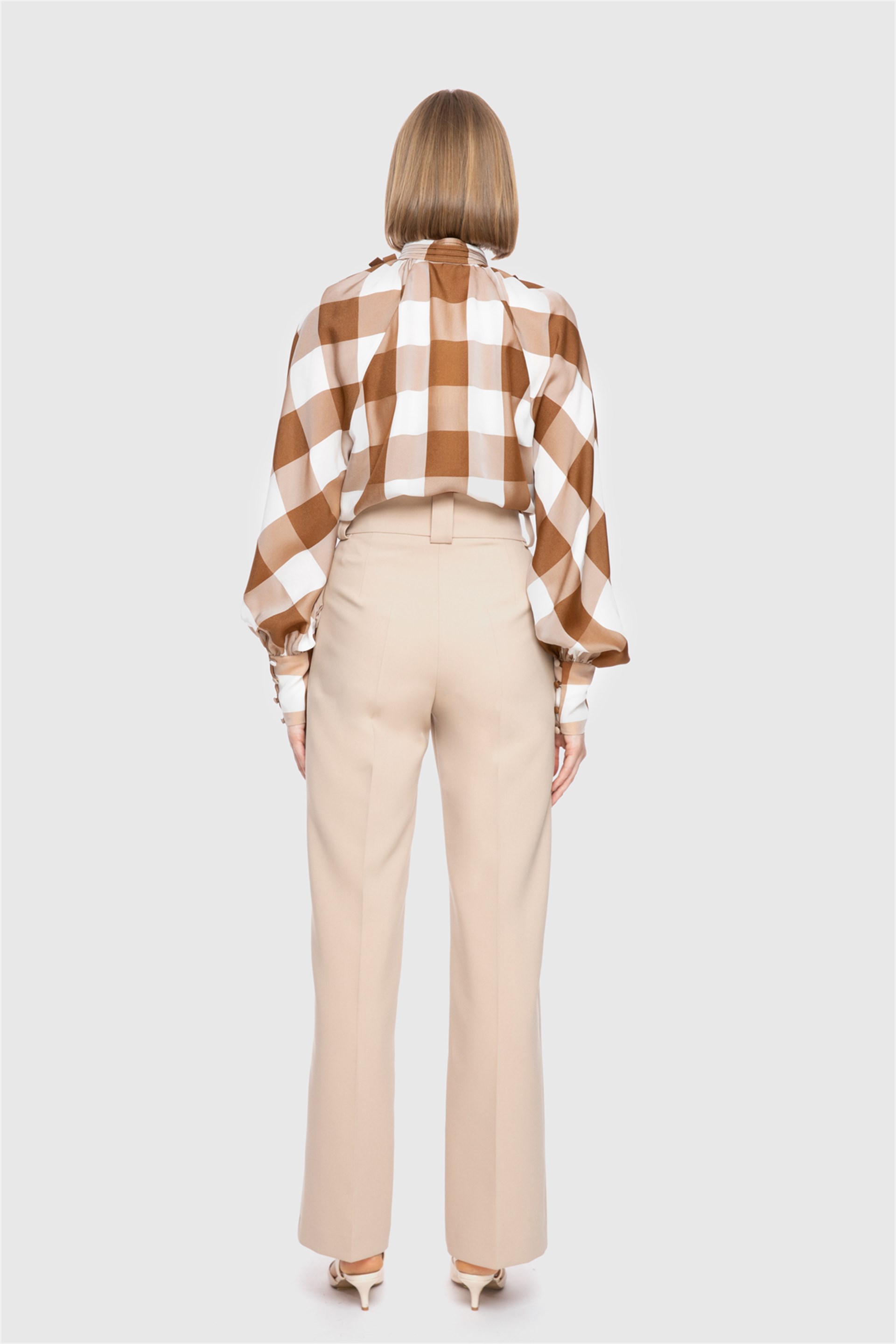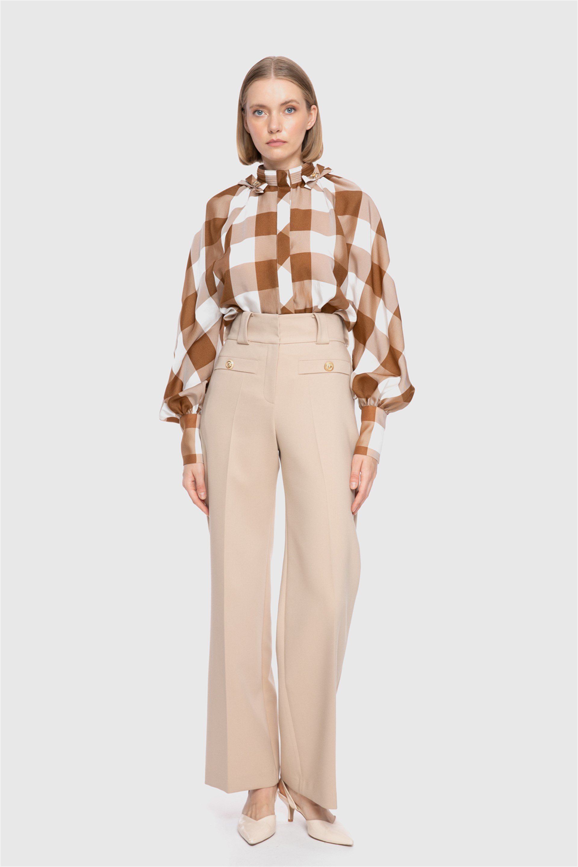 Gold Düğme Detaylı Yüksek Bel Bej Pantolon (M2KM1G0571)