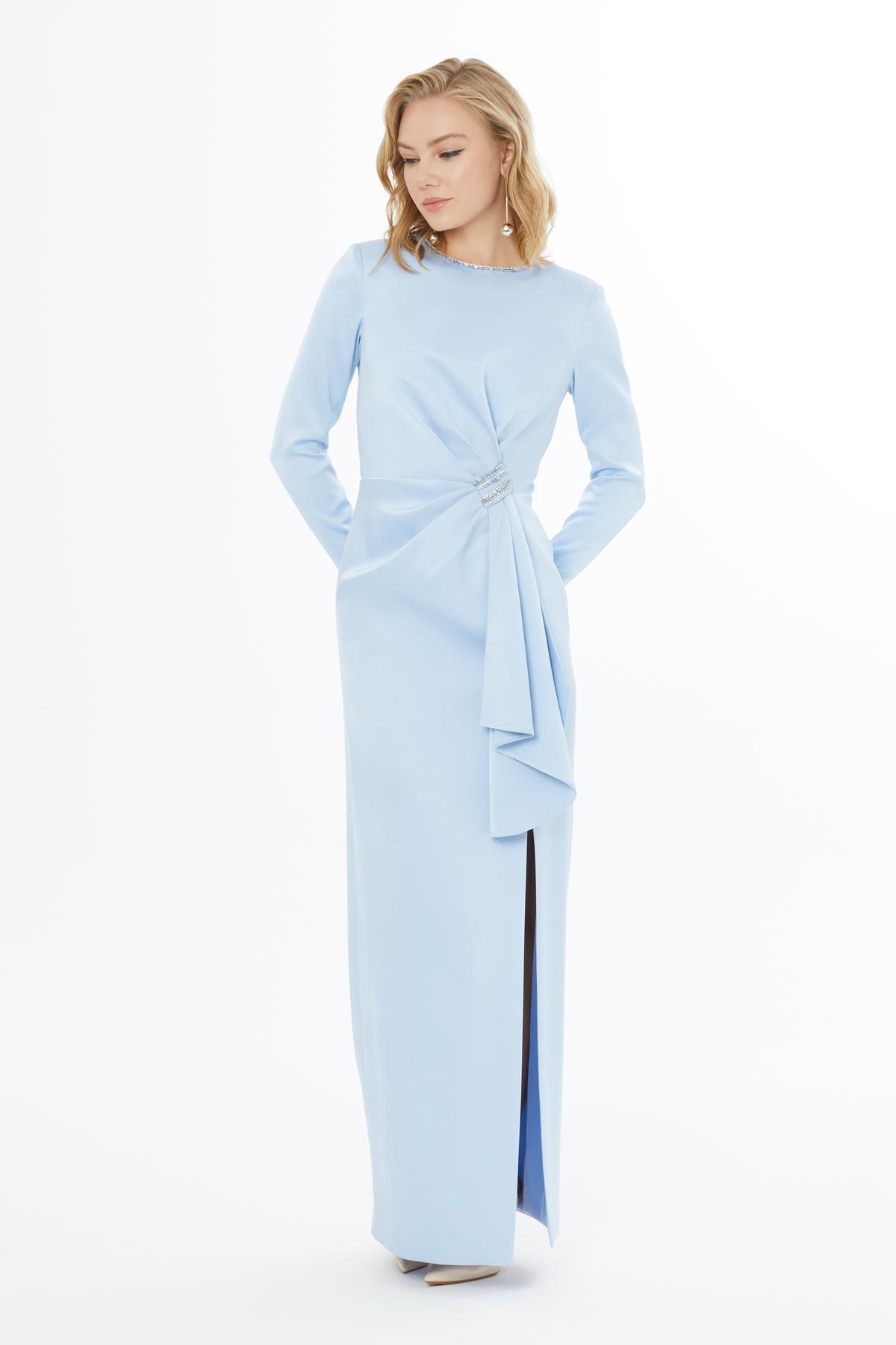 Volan Detaylı Taşlı Mavi Elbise (M5KM5M0771)